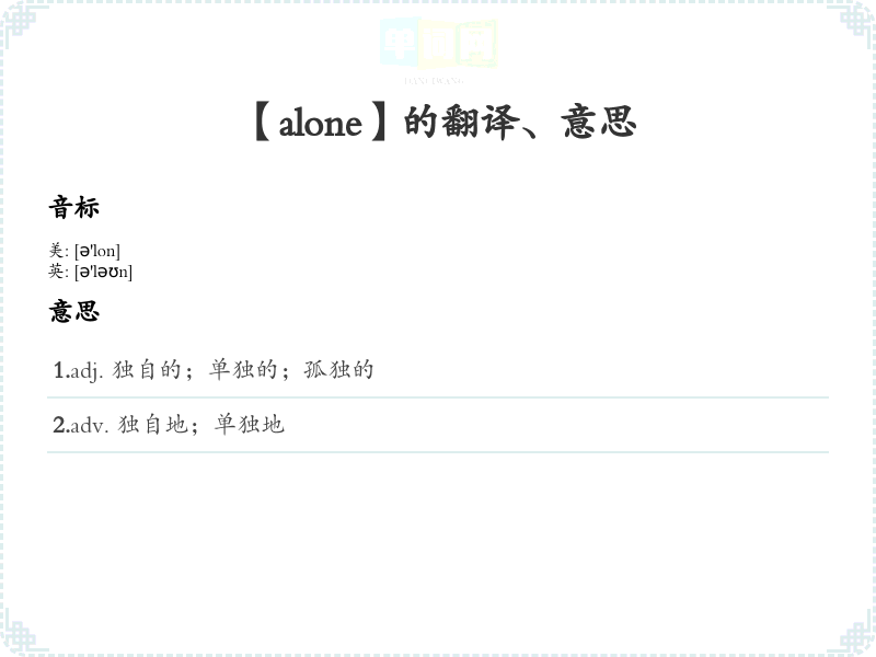 1.adj. 独自的;单独的;孤独的 2.adv. 独自地;单独地