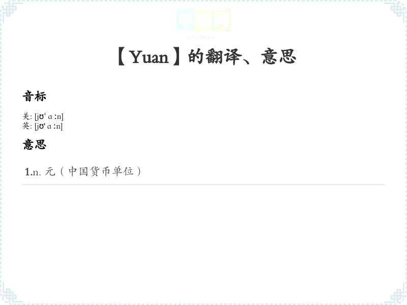 将“Yuan”发音为 /jʊˈɑːn/,可以通过反复朗读来加深记忆,跟随中文拼音的发音来进行记忆。 -