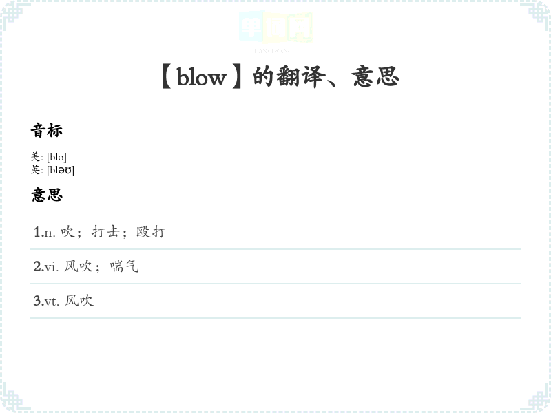 - “blow”的音标是 /bloʊ/。可以通过发音练*,反复朗读来加深记忆,结合单词的图像或动作(如吹气的动作)来帮助记忆。