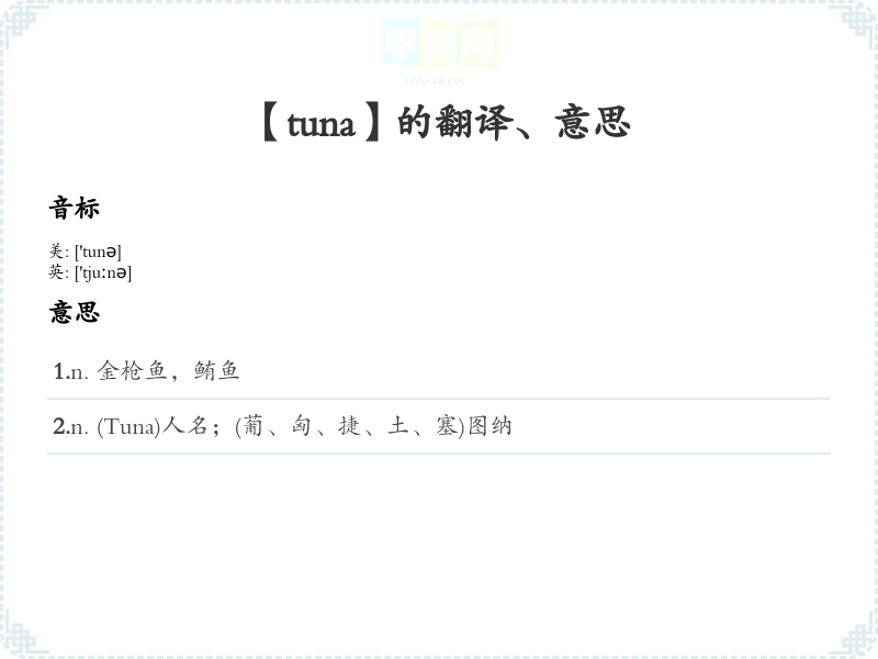 通过这些信息,学*者可以更全面地理解和使用“tuna”这个词。