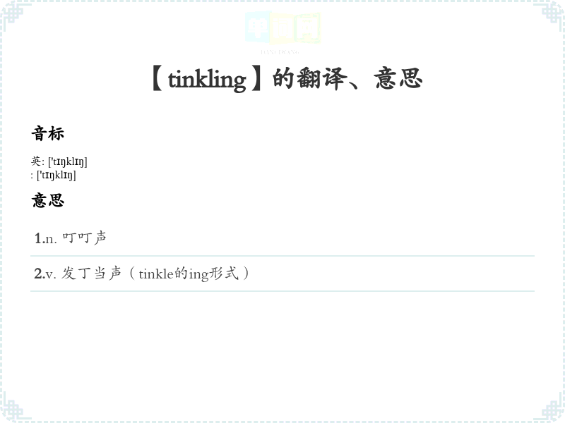 - 词源分析:Tinkling源自古英语“tincle”,意指“发出清脆的声音”。它由词根“tink-”与后缀“-ling”组合而成,后者通常表示动作或状态。