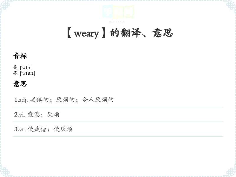 2.vi. 疲倦;厌烦 3.vt. 使疲倦;使厌烦