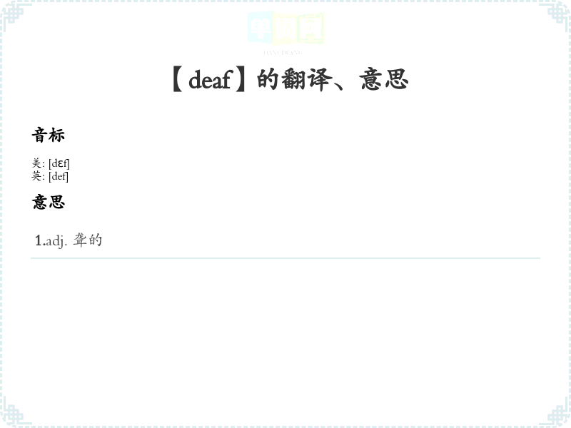 - 字面意思:该单词“deaf”的字面含义是“失去听力”或“听不见”。清晰的定义为:对声音没有感知能力,通常指耳朵的生理缺陷。