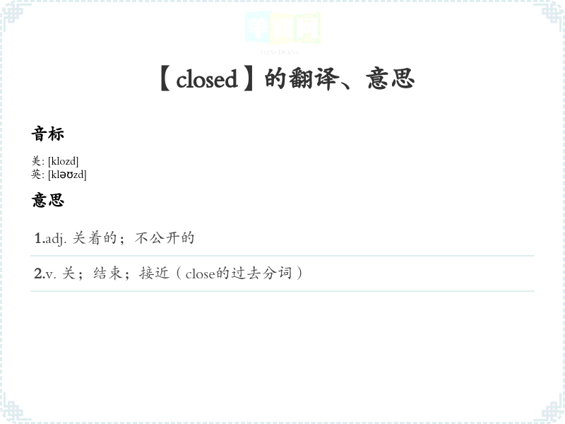 1.adj. 关着的;不公开的 2.v. 关;结束;接近(close的过去分词)