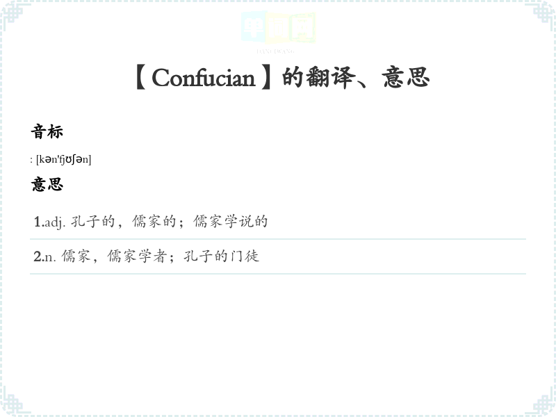 - 字面意思: "Confucian" 是形容词,指与孔子及其思想、哲学有关的。定义为:与孔子(**古代伟大的哲学家和教育家)及其伦理、道德、政治思想相关的。