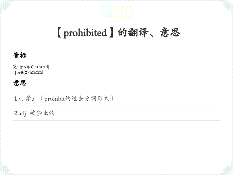 1.v. 禁止(prohibit的过去分词形式) 2.adj. 被禁止的