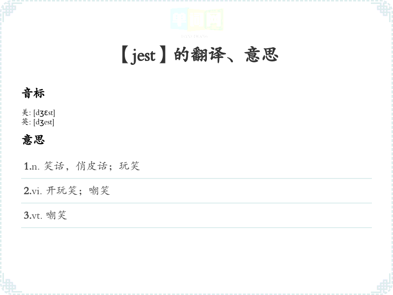 - 常用搭配:make a jest, a jest about, in jest, jesting tone, jest and jibe