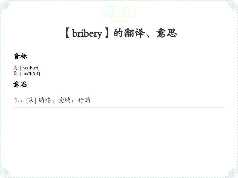 - 字面意思:Bribery 是指通过提供不正当的利益或金钱以影响他人的行为或决策。清晰的定义为:使用贿赂来获得不正当的利益或影响他人。