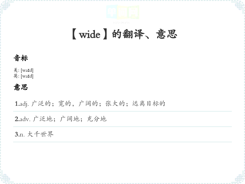 - /waɪd/,可以通过反复听读和模仿发音,加深对单词的记忆。