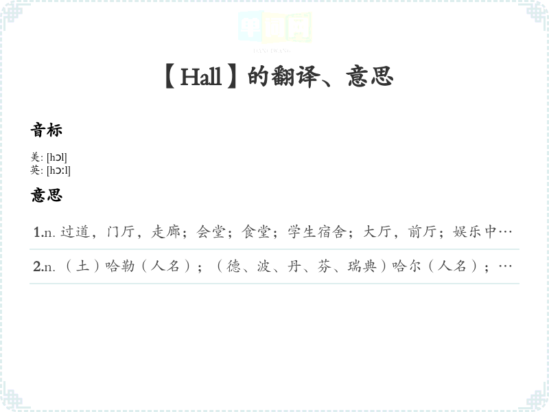 通过以上分析,可以更深入地理解“hall”这个词的用法和含义。