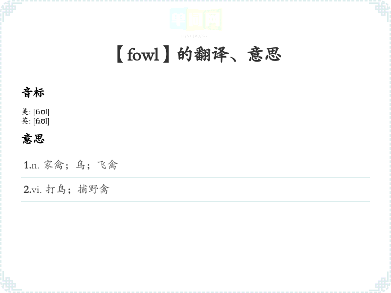- 词根记忆法:记住“fowl”的历史根源,联想到古英语的“fugol”,帮助记忆。