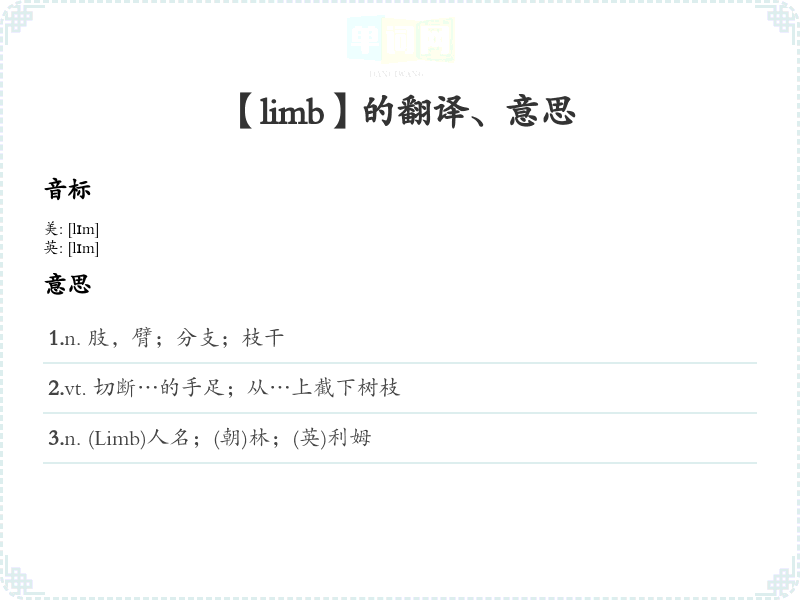 - 音标记忆法:发音为/lɪm/,可以联想“limb”和“limb of a tree”(树枝),树干和树枝的关系帮助记忆。
