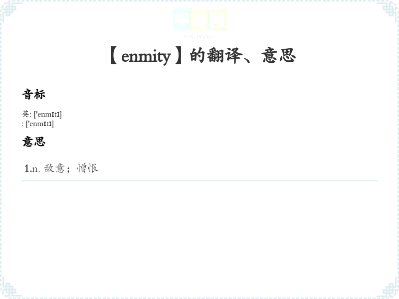 - 字面意思:enmity 指的是一种深刻的敌意或仇恨。清晰的定义为:一种长久的敌对关系或强烈的敌意。
