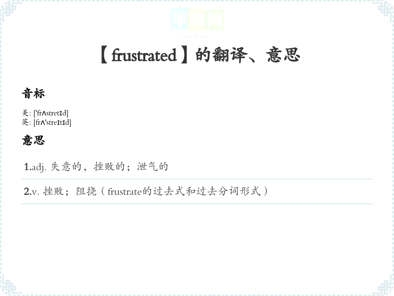 - 谐音联想记忆:可以将“frustrated”联想为“发愁的状态”,以帮助记忆其含义。