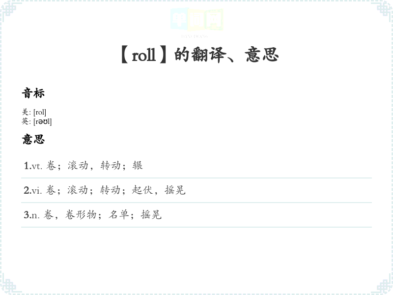 - 词性:动词(如“to roll”),名词(如“a roll”)。