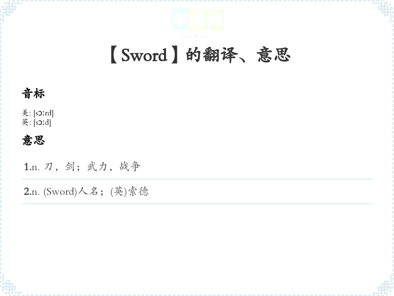 - 谐音联想记忆:将“sword”联想到中文的“所”,可以构建一个场景,例如“所用的武器是剑”,帮助记忆。