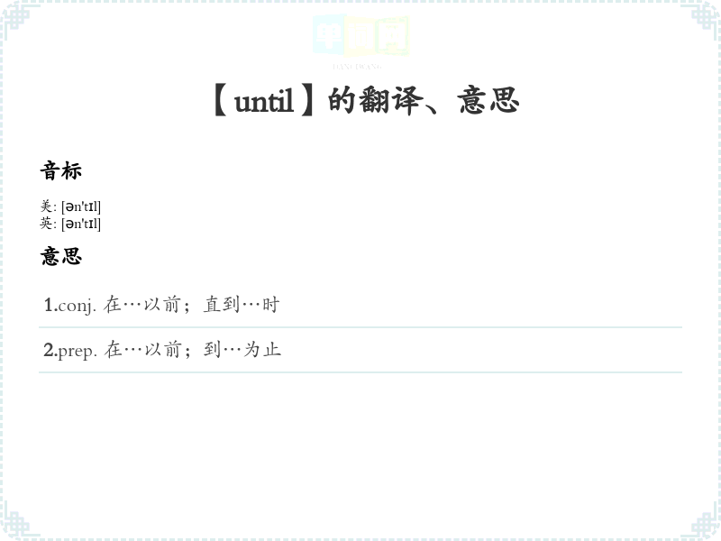- “until”的音标为 /ʌnˈtɪl/。可以通过分音节来记忆: