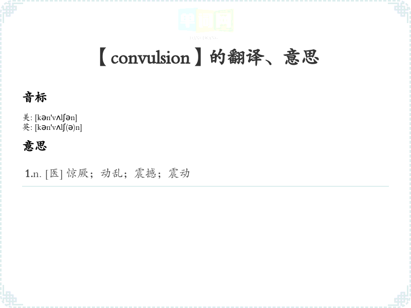 - 音标记忆法:记住“convulsion”的发音为/kənˈvʌlʃən/,可以将其分解为音节,进行重复练*,帮助记忆。