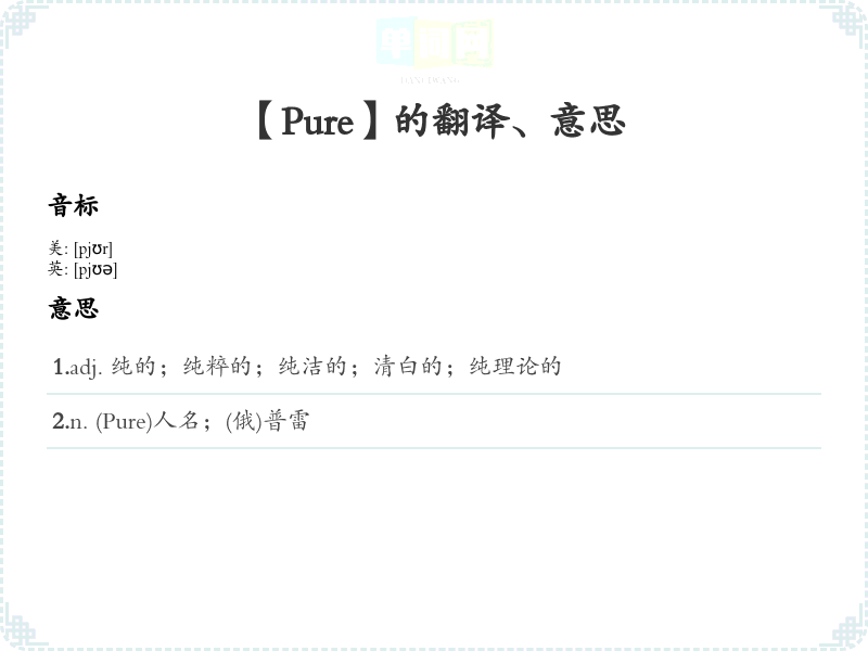 1.adj. 纯的;纯粹的;纯洁的;清白的;纯理论的 2.n. (Pure)人名;(俄)普雷