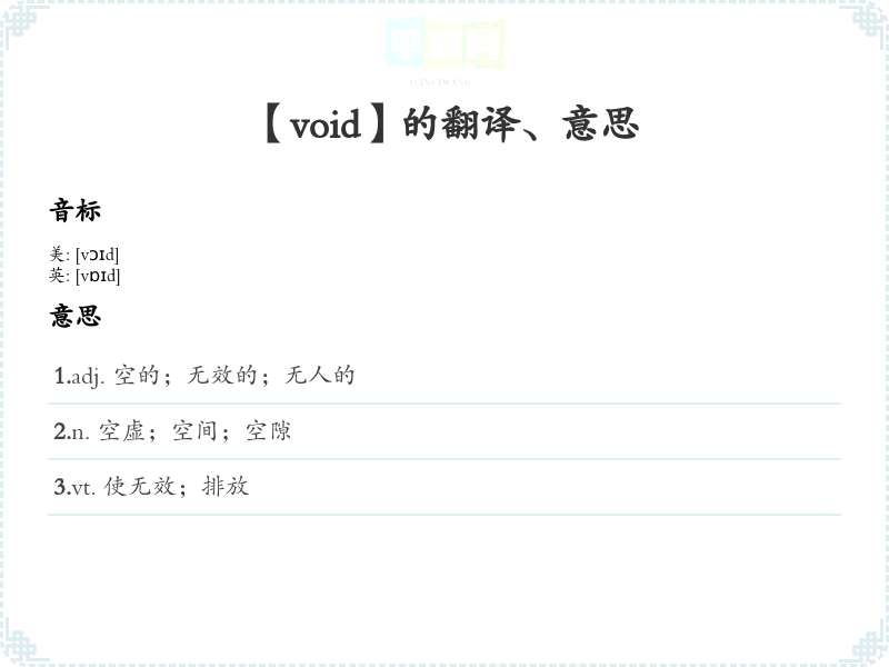 通过这些分析和示例,可以更全面地理解和使用 "void" 这个单词。