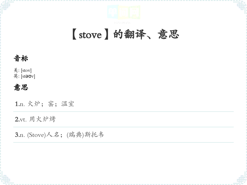 - 谐音联想记忆:可以将 "stove" 和“石头”(stone)联想,想象石头可以用来加热(如石头加热水)。