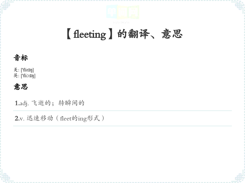 词源分析:Fleeting源自于古英语单词“fleotan”,意为“游动”或“漂浮”,与现代英语中“fleet”有关,后者意指快速,迅速的。