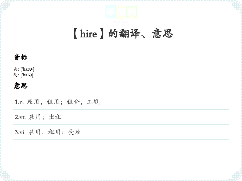 - 字面意思:Hire通常指雇佣某人做某事,或暂时租用某物。定义为“以支付报酬的方式聘用某人或租用某物。”