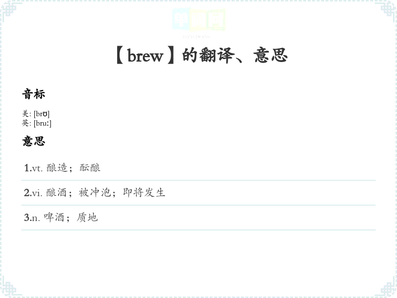 - 名词(noun):如“a brew”指代“饮品”或“酿造的饮料”。