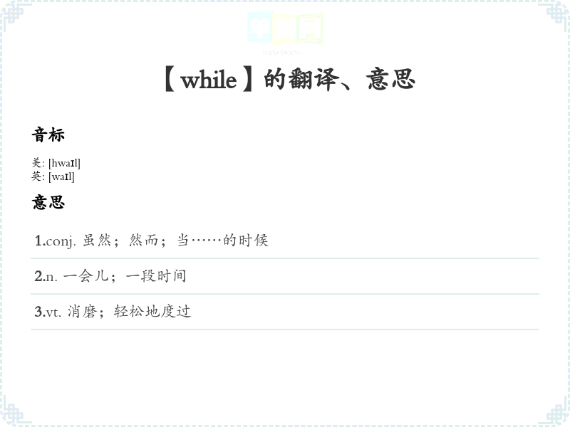 • 谐音联想记忆:可以联想到“我走的时间”,把"while"与"我走"发音相近的词联系起来,帮助记忆。