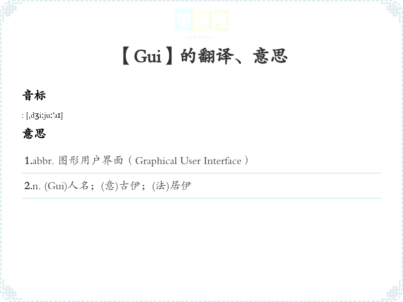 1.abbr. 图形用户界面(Graphical User Interface) 2.n. (Gui)人名;(意)古伊;(法)居伊