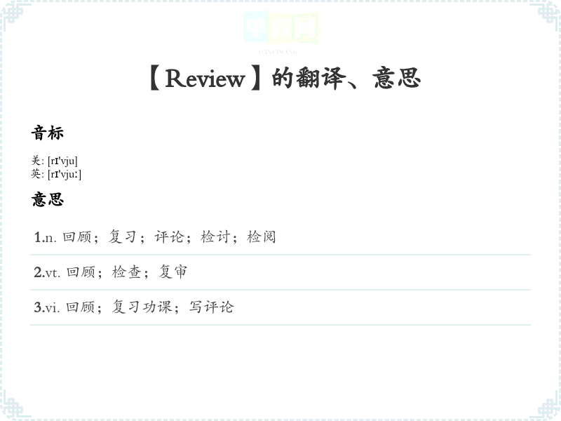 2.vt. 回顾;检查;复审 3.vi. 回顾;复习功课;写评论