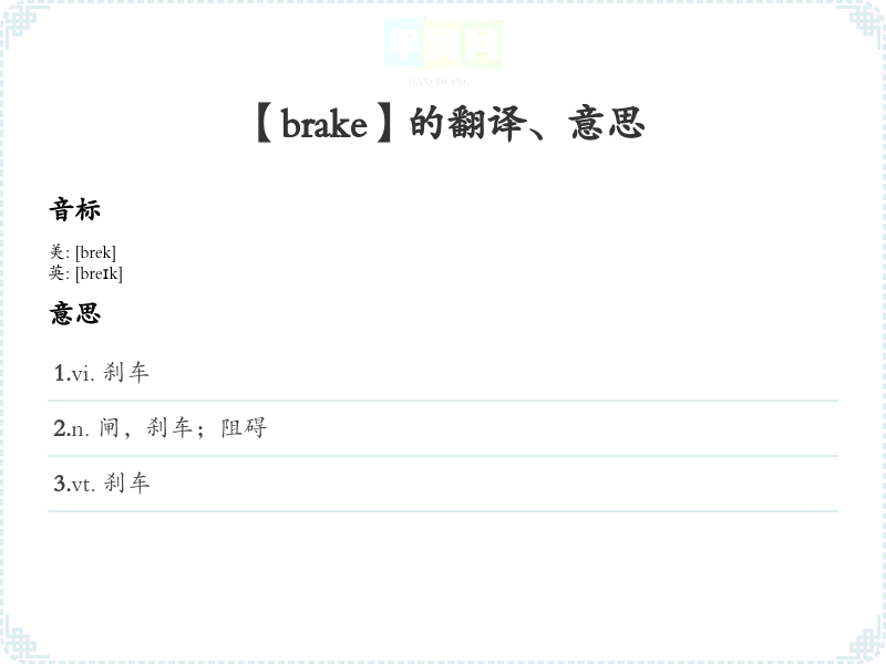 - 谐音联想记忆:可以联想“brake”与“刹车”这个词的发音相近,帮助记忆。