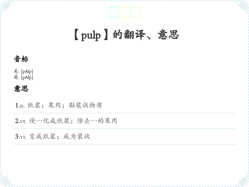 - 谐音联想记忆:将“pulp”联想为“扑扑”,想象着果肉被压扁,形成浆状物。通过这样的联想,可以更容易记住这个单词的含义。