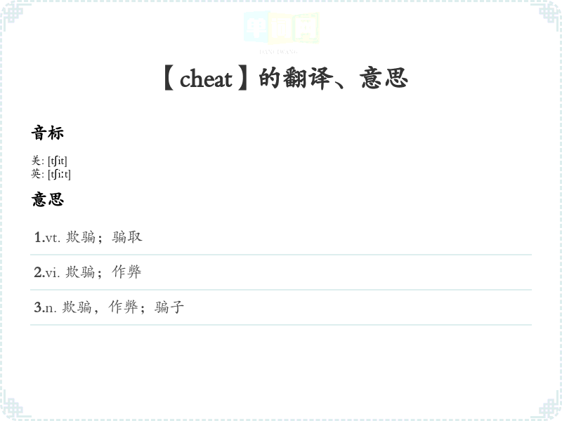 - 通过发音记忆“cheat”的发音 /tʃiːt/,联想“cheat”与“seat”(座位),想象一个人坐在座位上作弊。