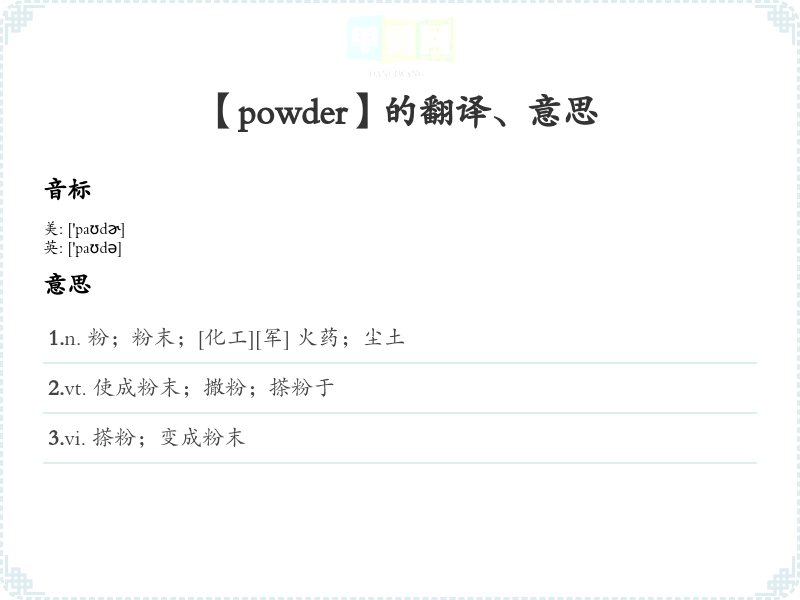 - 音标记忆法:学*其音标为 /ˈpaʊ.dər/,通过反复朗读来巩固记忆。