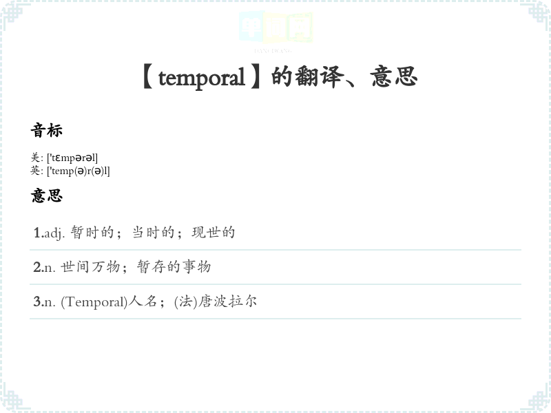 - “Temporal” 源自拉丁语“temporalis”,意为“时间的”。其词根“tempus”意为“时间”,前缀和后缀没有特别的组成部分。