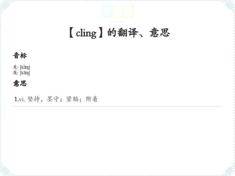 - 音标记忆法:/klɪŋ/。可以通过重复发音来加深记忆,同时联想“cling”与“clingy”(粘人的)相关词汇。