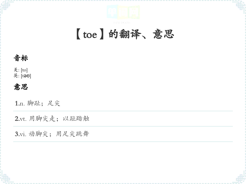 - 音标记忆法:Toe的音标是 /toʊ/,可以通过发音练*,结合形象化记忆,如想象一个脚趾的形状。