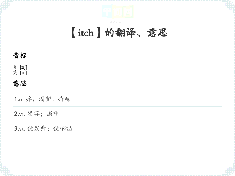 - 谐音联想记忆:将 "itch" 与“意吃”联想起来,想象因为痒而想要去吃东西,形成一种幽默的记忆方式。