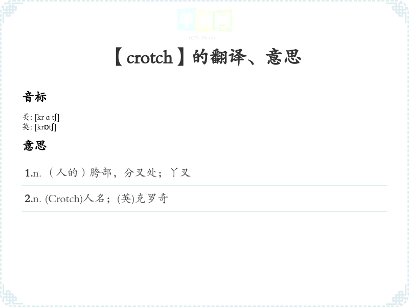 - 音标记忆法:/krɒtʃ/。可以通过分解音节来记忆,比如“crotch”音与“catch”相似,通过联想记住。