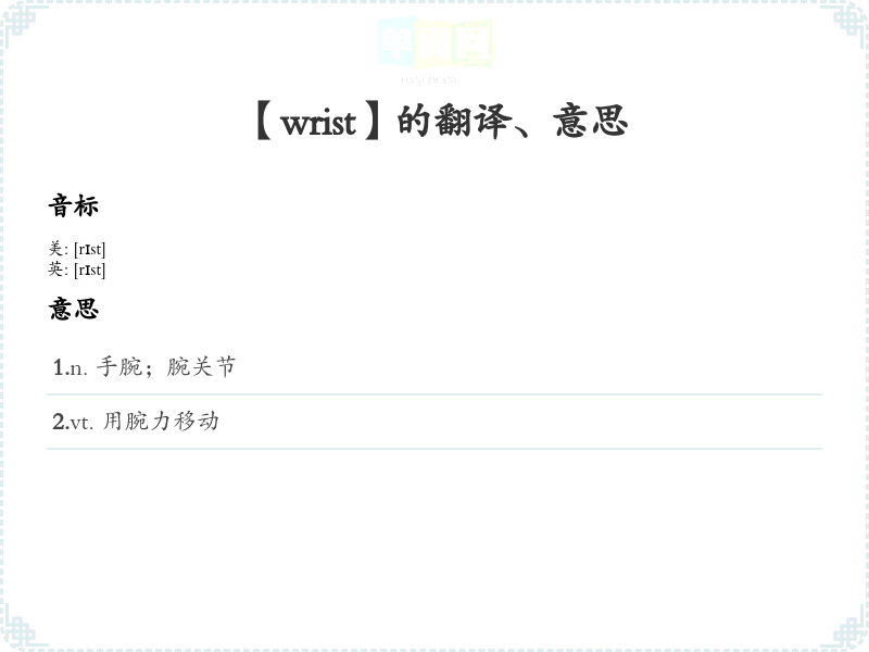 词源分析:Wrist源自古英语单词“wrist”或“wrista”,这可能与日耳曼语的词根“wrist”相关,意为“扭曲”或“弯曲”,反映了手腕的功能和形状。