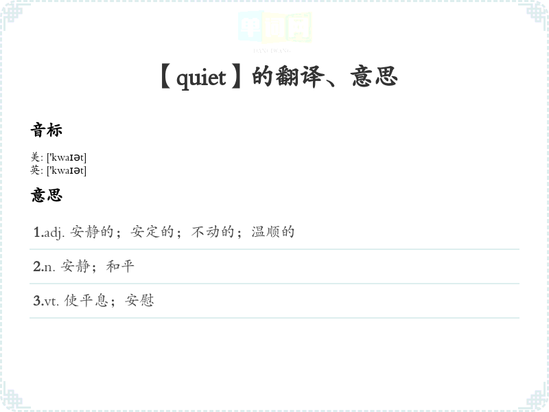 - 字面意思:Quiet 指的是一种状态,表示没有声音或声音非常小。清晰的定义是“使安静或保持安静的状态”。