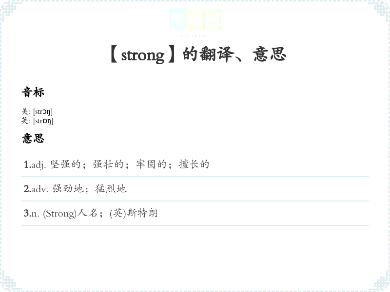 - 词根记忆法:首先识别“strong”的词根“strang”,可以联想到“拉紧”的含义,帮助理解其力量的概念。可以把“强”与“紧”联系起来记忆。
