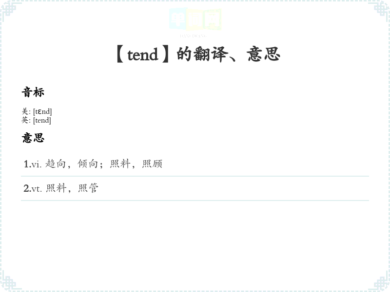 - 字面意思:动词"tend"的字面意思是“照顾、看护或倾向于某事”。