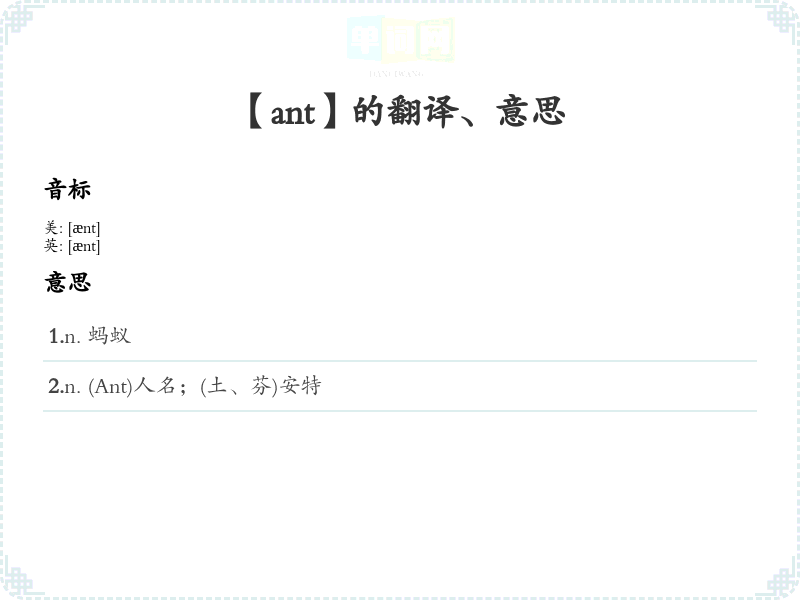 - 音标记忆法:将“ant”的发音与“aunt”相结合,想象一只蚂蚁在你姑姑的面前走来走去。