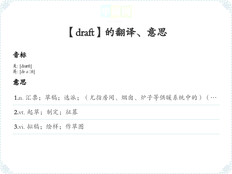 - 音标记忆法:可以将 draft 的音标 /dræft/ 与“拖拉”的发音联系起来,帮助记忆。