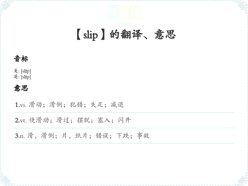 通过以上分析,可以更好地理解和记忆单词 "slip"。