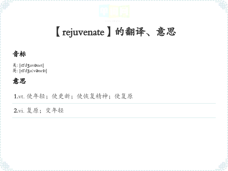 - 通过分析前缀 "re-" 和根词 "juvenate",理解其字面含义,帮助记忆。