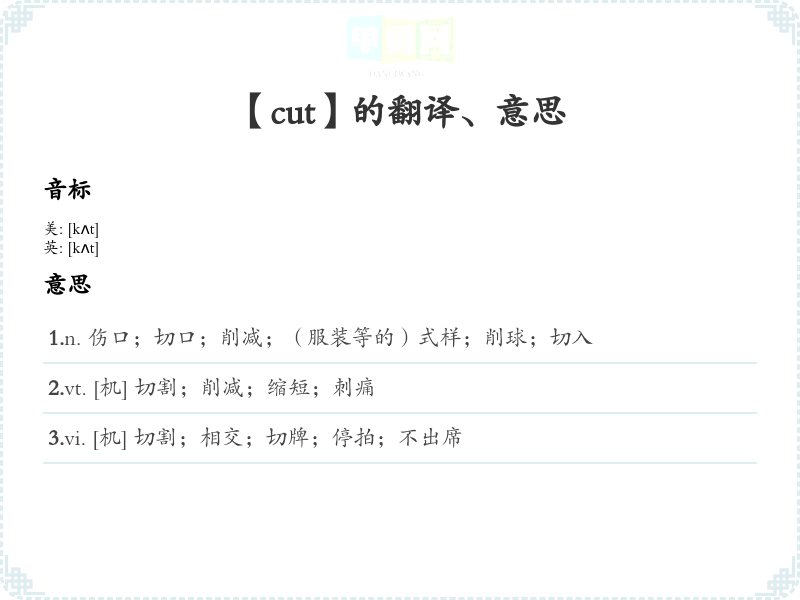 - /kʌt/ 通过反复朗读和拼写练*,加深对发音的记忆。