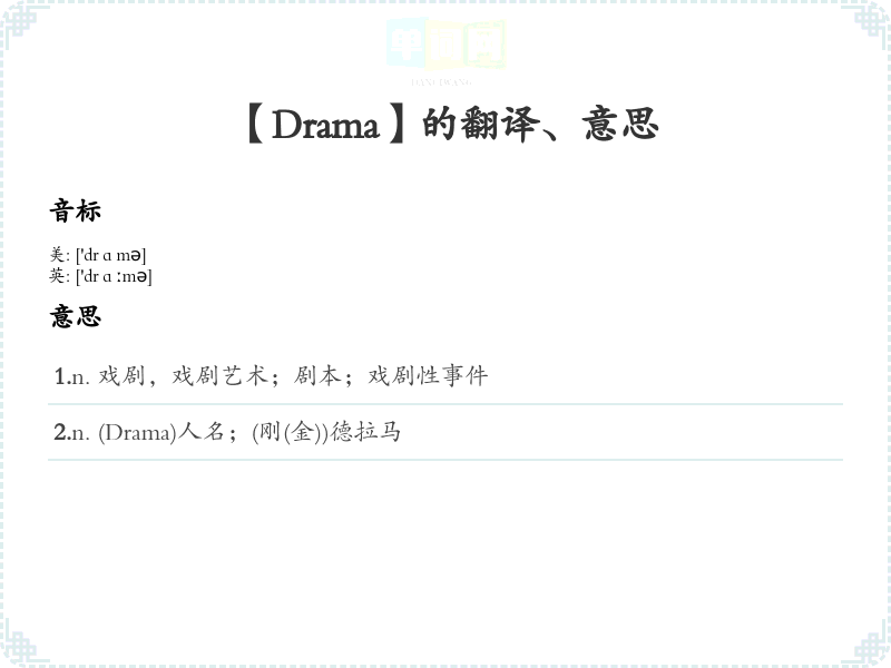 - 字面意思:Drama的字面含义是“戏剧”,指的是一种通过表演和对话来讲述故事的艺术形式。